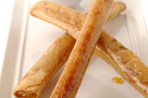 Ôter la croûte puis couper le pain en quatre tranches de 2 cm d’épaisseur. Les retailler en rectangles de 6 x 3 cm. Éplucher la gousse d’ail puis la frotter sur les deux faces des rectangles de pain. Les badigeonner d’huile d’olive à l'aide d'un pinceau. Les faire dorer dans une poêle anti-adhésive sur chaque côté. Les réserver sur un papier absorbant.