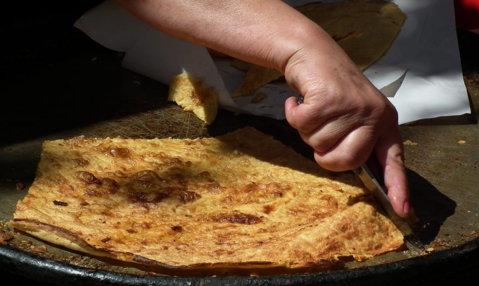 Des wraps de socca garnis aux sardines, ricotta, concombre avec du citron, oignon, et curcuma.