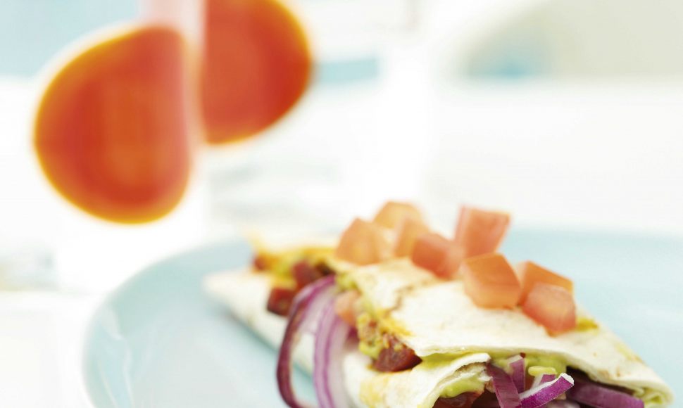 Préchauffez l’appareil à croques et gaufres. Tartinez chaque tortilla de guacamole. Répartissez les dés de tomates et de chorizo et parsemez d’oignon. Roulez la tortilla sur elle-même, le plus finement possible.