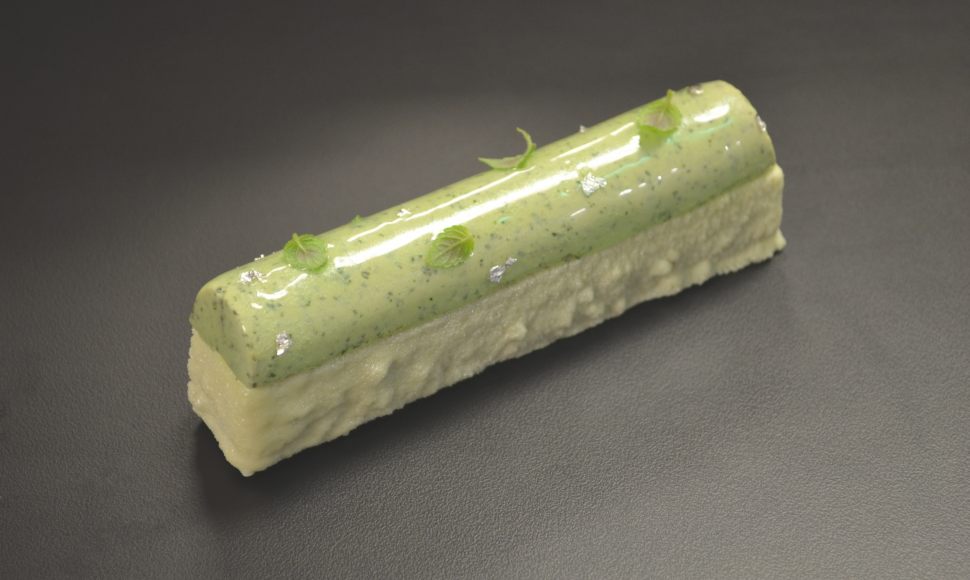 L'association de la pomme Granny, du shiso vert et du poivre de Sichuan en font un dessert fruité et frais, adouci par la coque en chocolat blanc et relevé par le croustillant du streuzel.