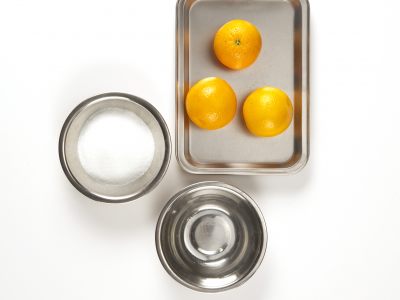 Prélever les zestes des agrumes (non traités) avec un couteau économe. Les faire tremper dans de l’eau froide pendant 2 heures.